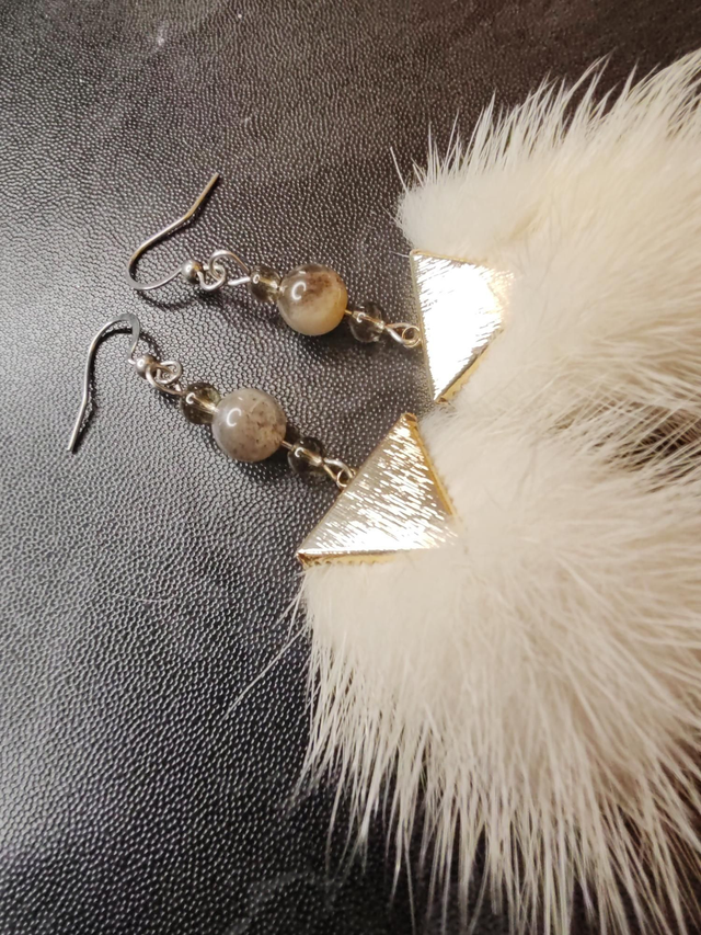 Attaches acier inoxydable. Pierres fines : quartz fumé et quartz rutilé. Pompons vison écru.