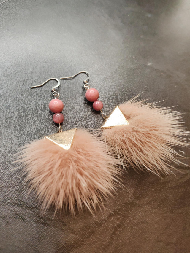 Attaches acier inoxydable. Pierres fines : rhodonite et tourmaline rose. Pompons vison vieux rose. Pièce unique