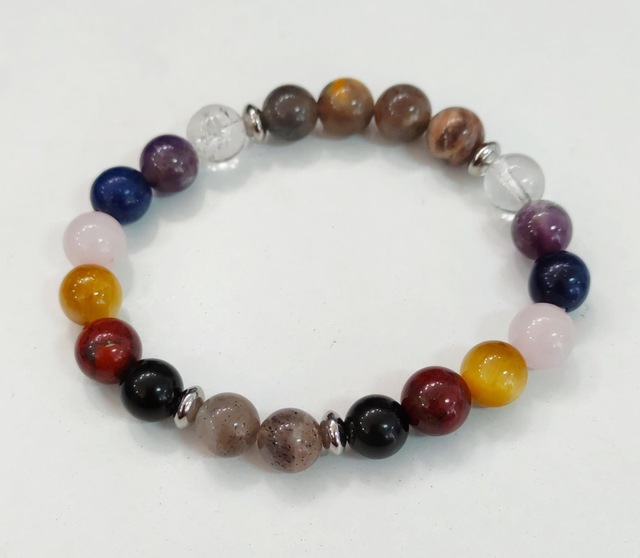 Lapis lazuli, lépidorite, charoïte, grenat, fluorite, jais, pierre de lune, pierre de soleil, pierre de lave, howlite, oeil de tigre, oeil de tigre teinté vert, Turquoise africaine, jaspe rouge, jaspe héliotrope, rhodonite, Opale rose du Mexique, citrine chauffée, cornaline, sodalite, rubis zoisite.