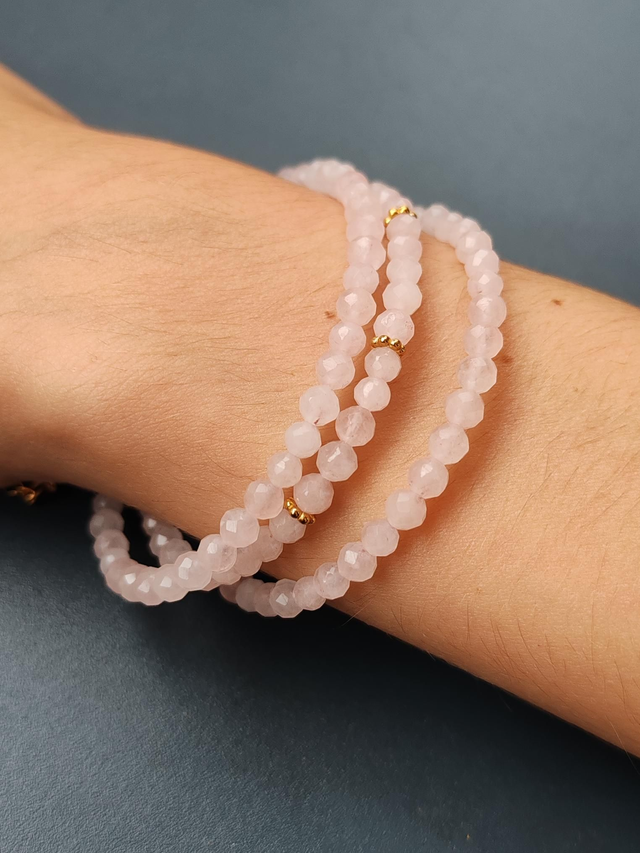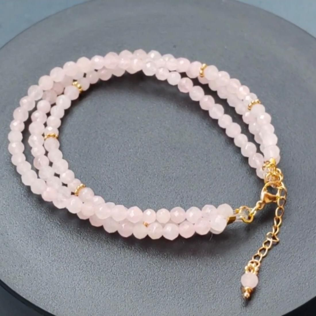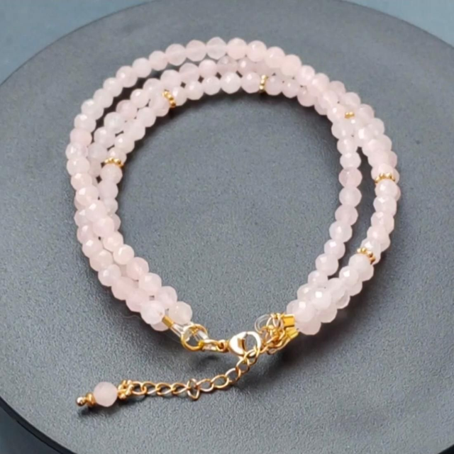 Quartz rose facettes monté sur fil nylon et acier inoxydable or. Pièce unique.