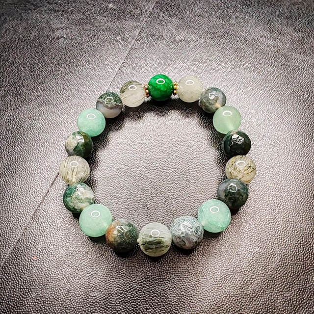 Quartz rutile vert, aventurine, jadéite, agate mousse. Monté sur élastique tour de poignet 18cm