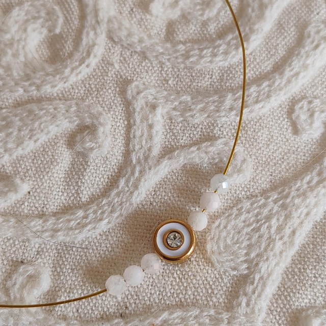 Fil d'acier inoxydable et béryl blanc. Pièce unique, longueur de 35 à 40 cm
