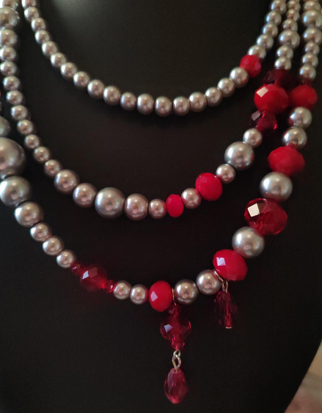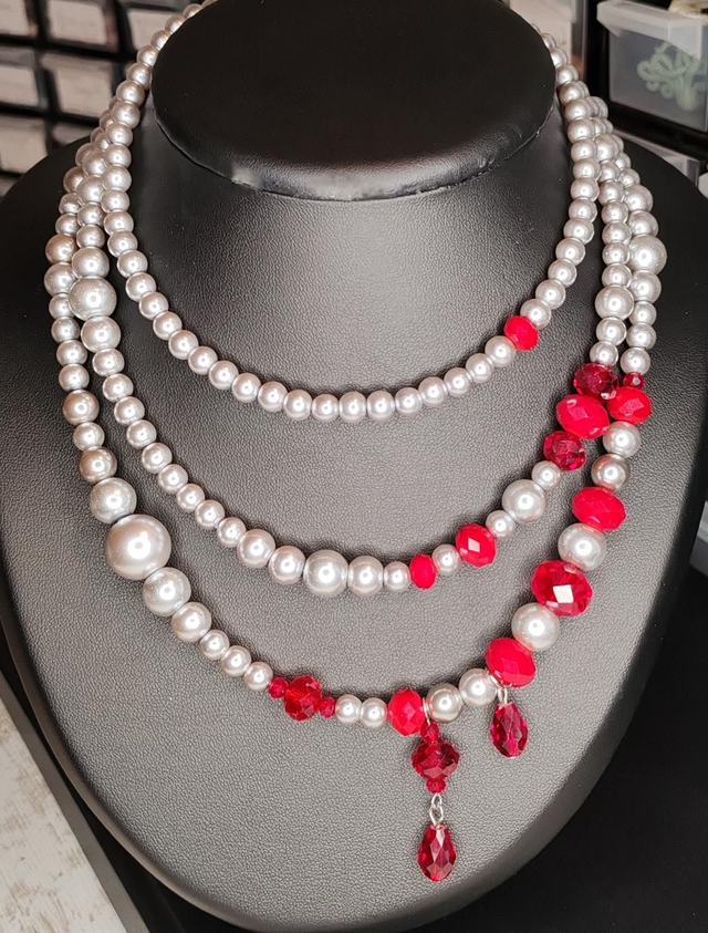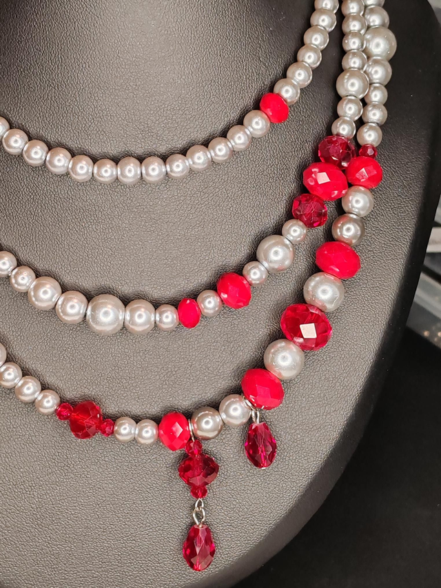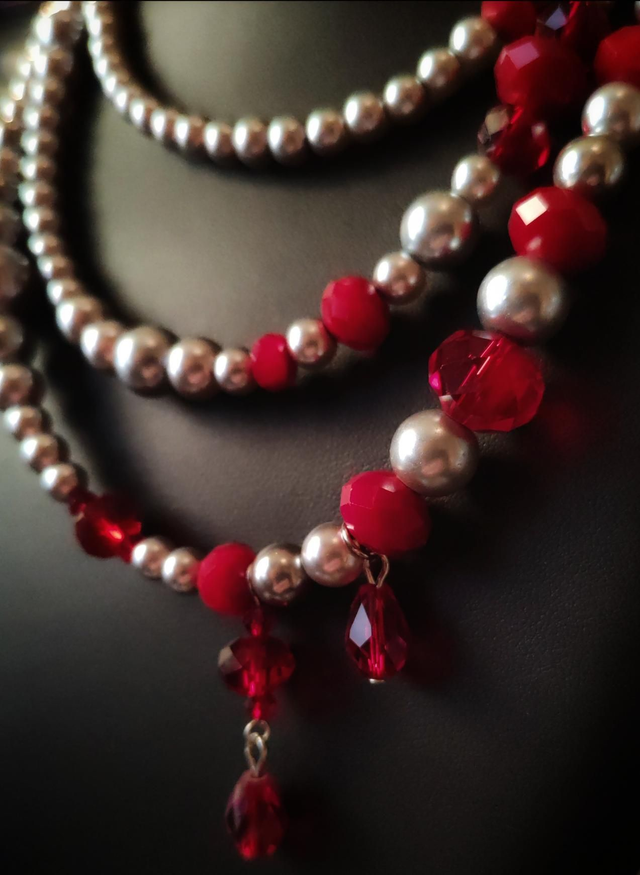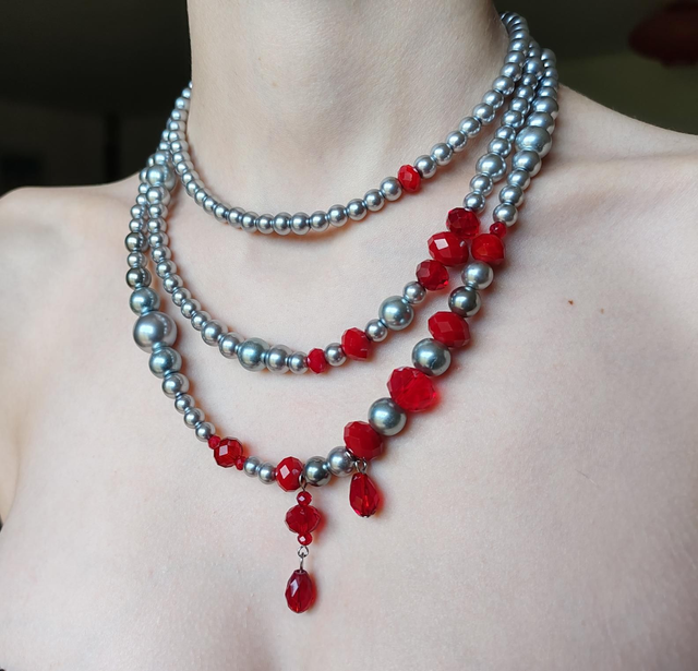Perles de verre rouge sang et perles synthétiques, acier inoxydable, fil nylon, trois rangs, tour de cou maximum 30 cm. Pièce unique.