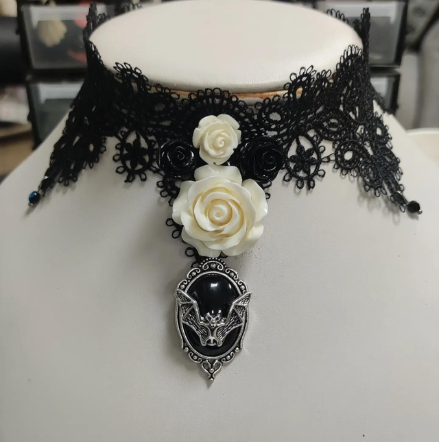 Ras du cou en dentelle noire, roses résine et alliage de zinc, perles de cristal.