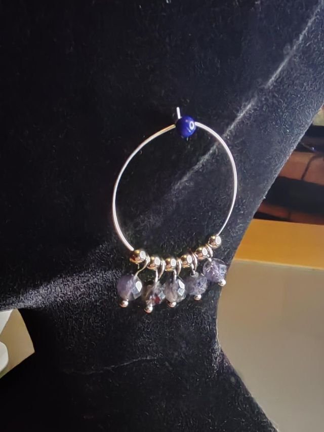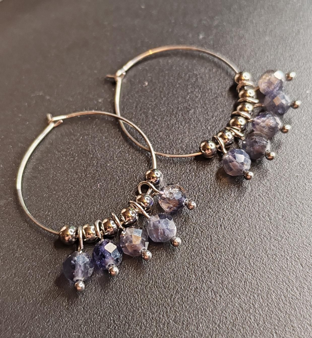 Boucles d'oreilles créoles en acier inoxydable et pierres fines : iolite. Pièce unique.